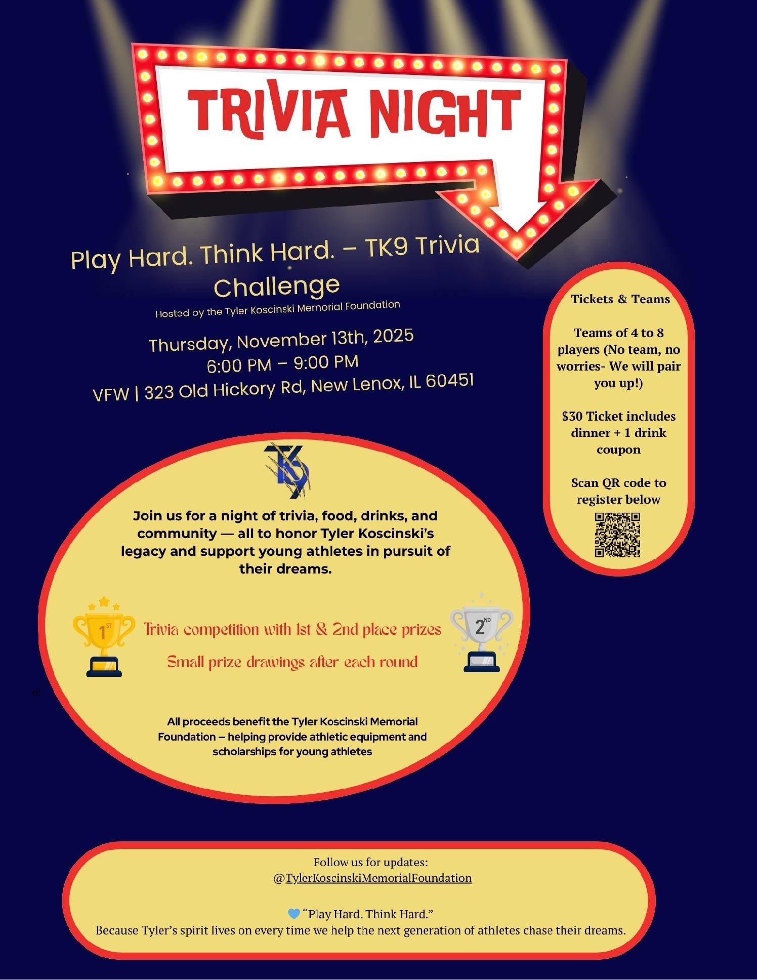 Join us for a night of trivia, food, drinks, and community to honor Tyler Koscinskiās legacy and support young athletes in pursuit of their dreams.